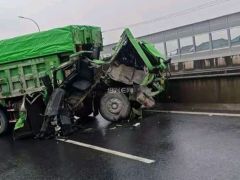 齐贤方向一辆大货车撞倒护栏车头都凹进去了