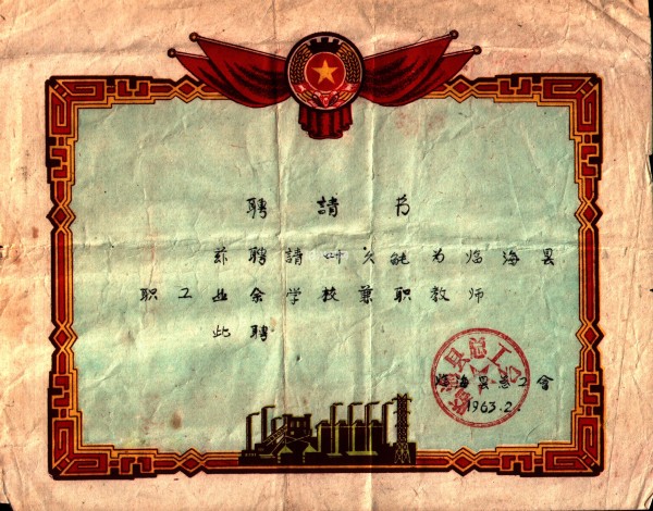 1957年底,我工作调动到台州地区的临海,工作之余,我还是在职工业余学校教书。这是我1963年的聘书