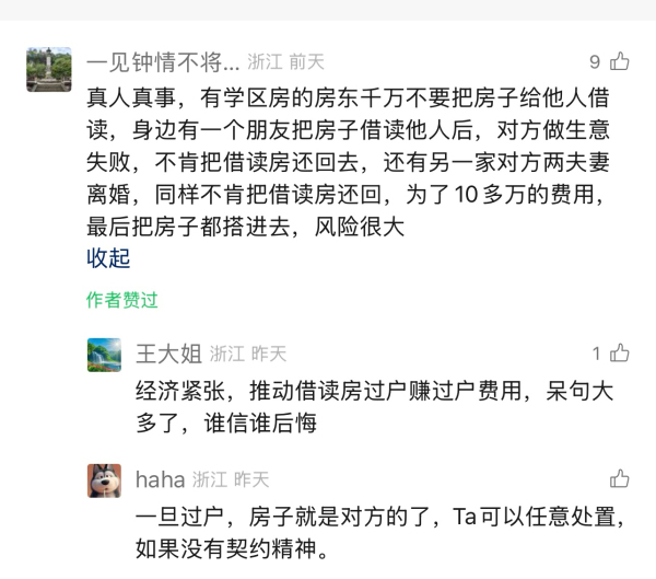 别的地方都没有学区房借读一说,就越城区有,估计全国其它地方都没有。自从挂牌卖学区房后,几乎每天都接到中介电话叫我借读,各种忽悠,说没什么风险。这个风险都是房东在承担,跟借读方有什么关系。房子赚个几万或者十几万过户给借读方,借读方用其它房子作为抵押,但是一旦借读方破产,那么学区房跟抵押的房子都会被管控,房东钱财两空,已经有暴雷的例子了,而且现在经济这么差,这个概率只会越来越大。中介为了赚中介费 ,会不停跟房东说没风险,真的出了事情,中介会来承担责任吗?房东们好好思考下吧。
