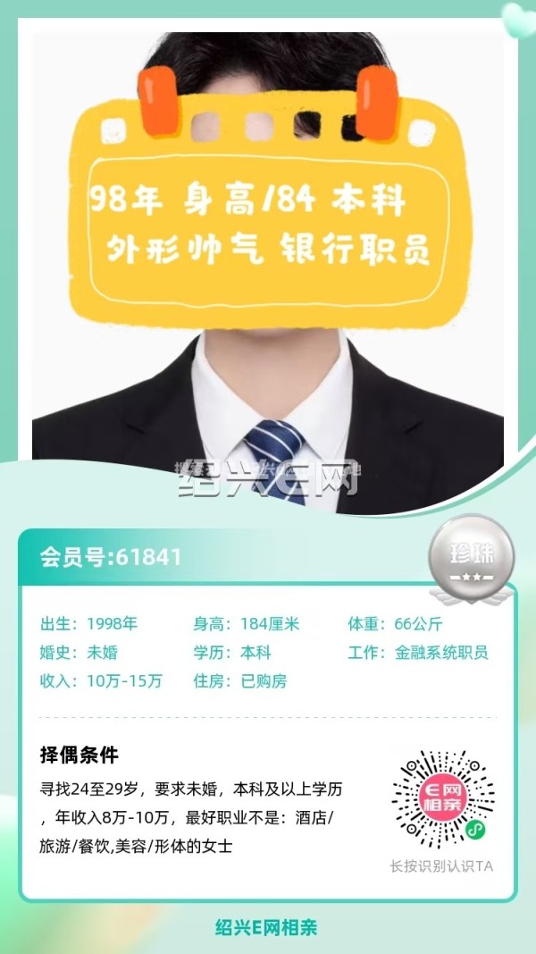 未婚,身高184,本科学历,银行职员,房车俱备。