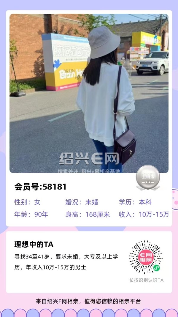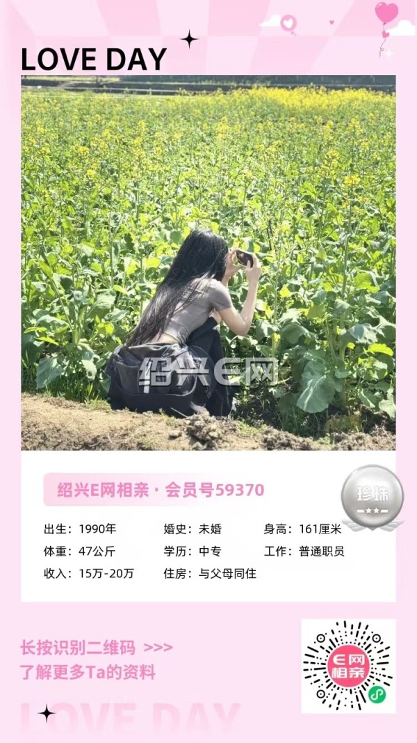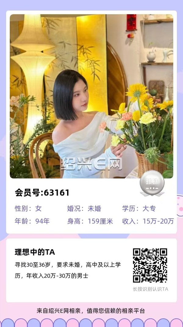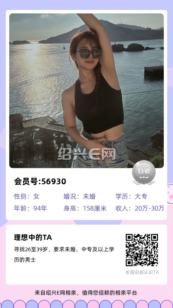 94年未婚,湖北姑娘在柯桥经商,妈妈也在这边帮忙照看,未来打算定居柯桥,目前自营个体,收入20-30万,有车。