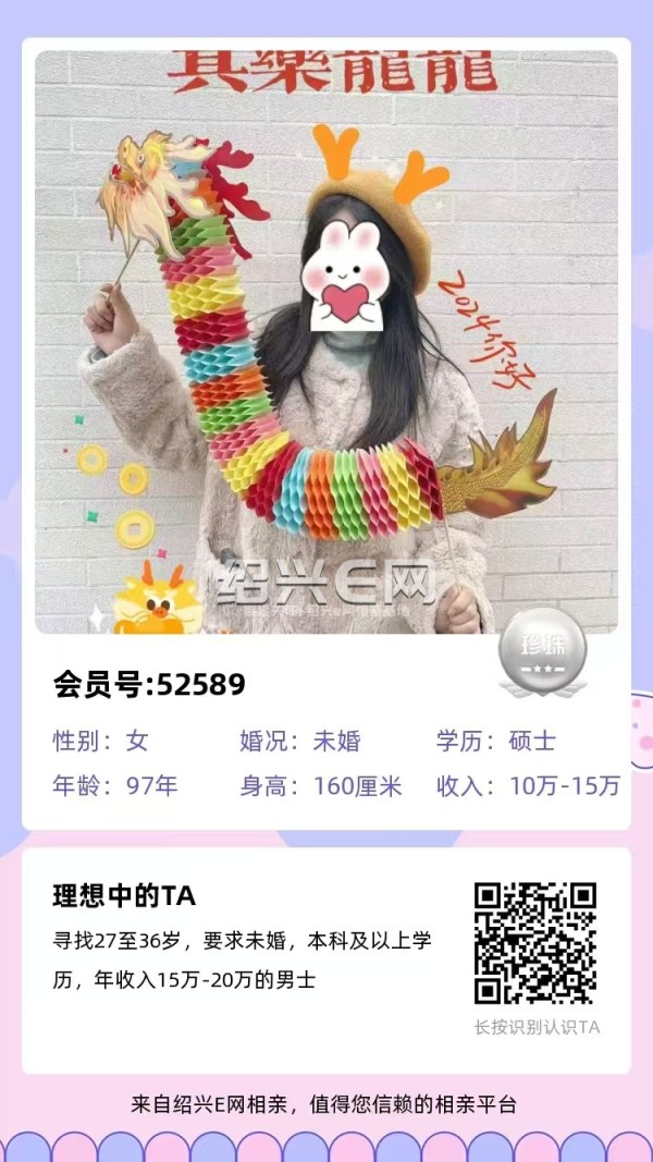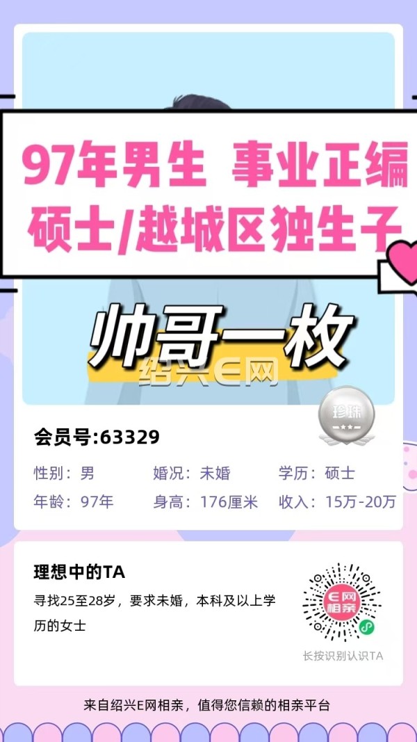 96年越城区独生子,未婚,硕士学历。