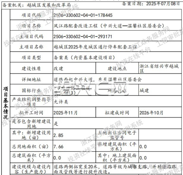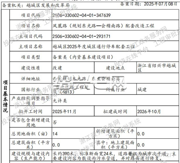 凤凰路(规划东光路—会稽南路)配套改造 工程。长约390米,标准断面宽24米,道路等级为城市次干道,主 要建设内容为敷设雨污水管道,并对路面进行修复。计划投资1008万。11月开工。