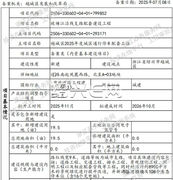 坡塘江沿线支路配套建设工程,路红线宽9米,道路等级为城市支路,项目具体建设内容包 括:道路工程、交通工程、排水工程、景观绿化工程、照 明工程以及相应配套管线等工程。同时对沿河约8900平方 米的景观绿化进行提升改造,并新建沿河挡墙及108个生态 停车位(含16个充电桩)。计划投资4170万,11月开工。
