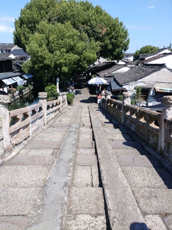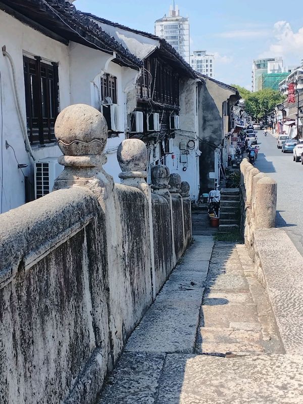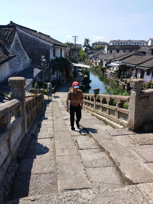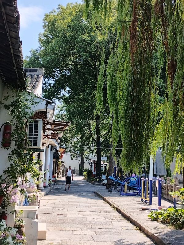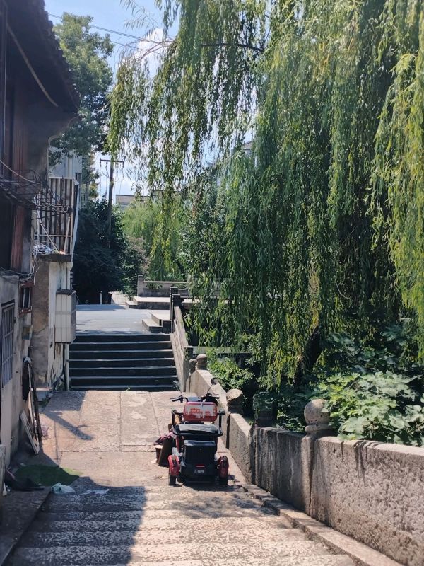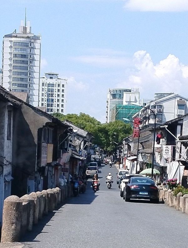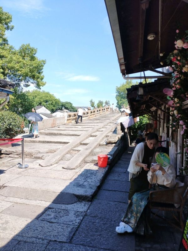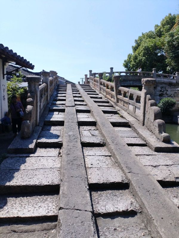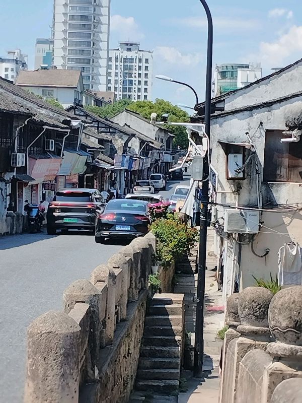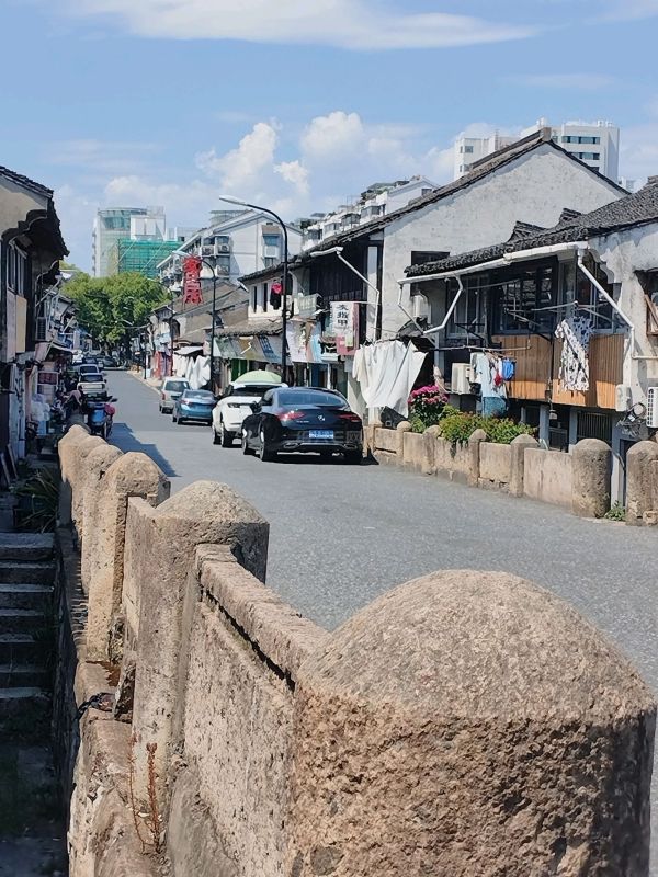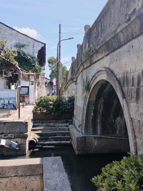 过了八字桥就顺着下坡的踏步往下漫行,看到几位白发苍苍的老人,正在兴致勃勃地围坐闲谈,他们的脸上洋溢着甜蜜的笑容,这使我骤然明白江南水乡的魅力,不仅在于它的古韵风情,更在于这世代相传的人情味。在河边的石板路有买菜归来的家庭主妇,有赶着去上班的年轻人,还有背着书包去上学的孩童。有几户人家在门前晾晒衣服,有的手捧饭碗闲聊,还逗弄着自家的孩子,这番景象宛如一幅恬静的生活画卷。现代生活在这古老的石桥,也如同桥下的碧波河水,既有历史传统的沉淀,又充满了时代新的活力。