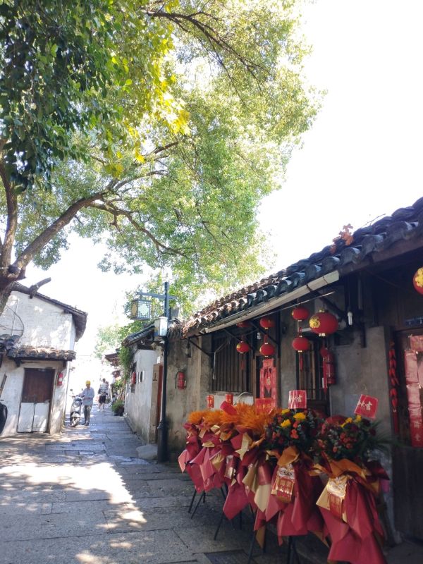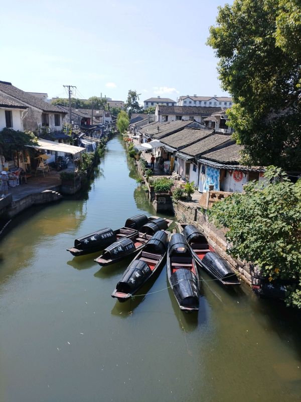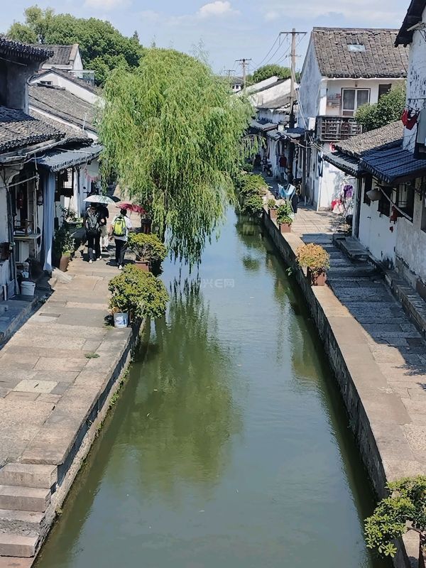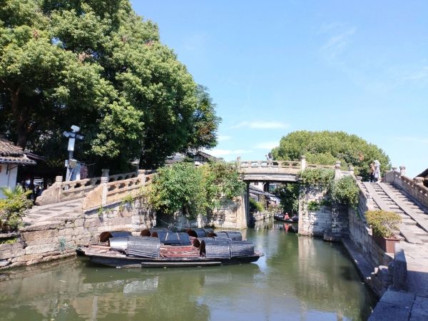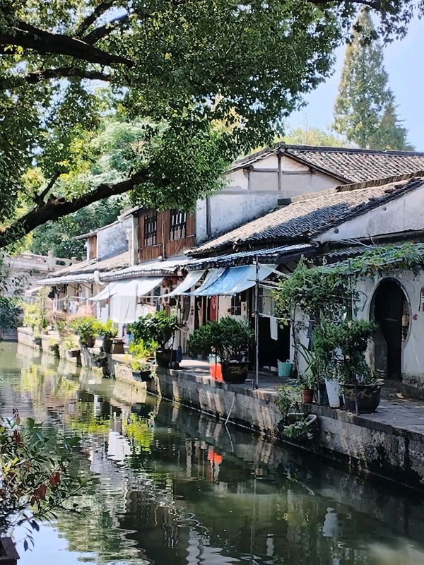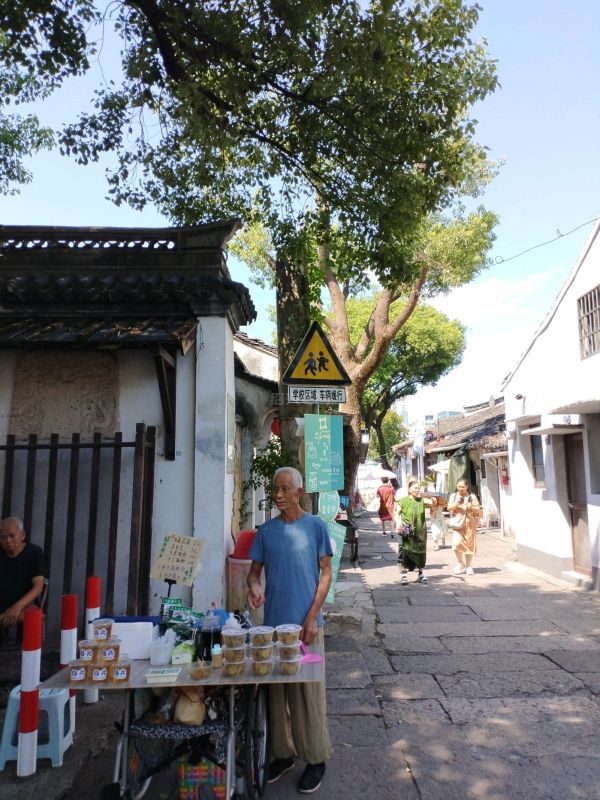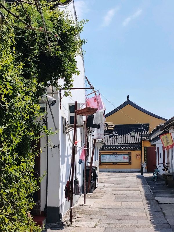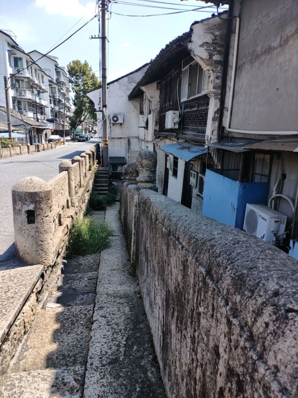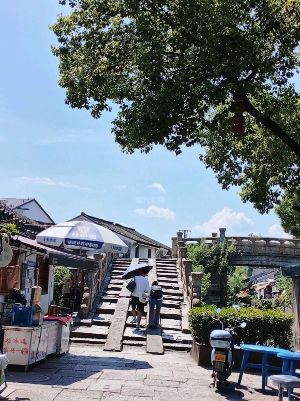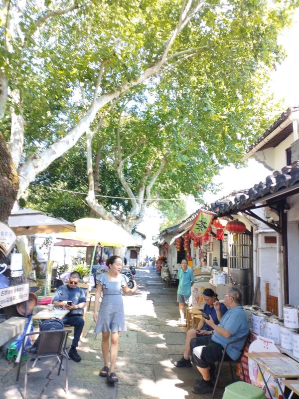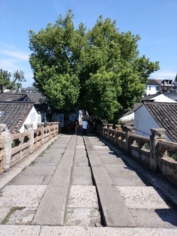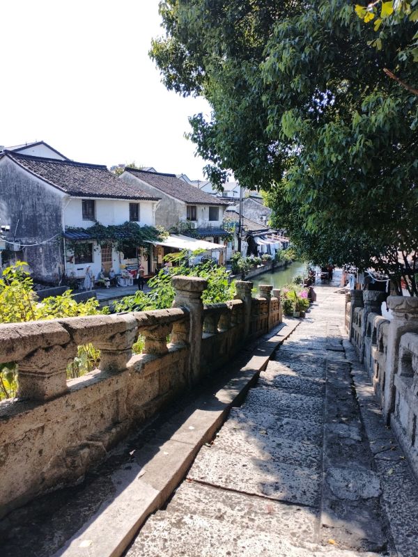 过了八字桥就顺着下坡的踏步往下漫行,看到几位白发苍苍的老人,正在兴致勃勃地围坐闲谈,他们的脸上洋溢着甜蜜的笑容,这使我骤然明白江南水乡的魅力,不仅在于它的古韵风情,更在于这世代相传的人情味。在河边的石板路有买菜归来的家庭主妇,有赶着去上班的年轻人,还有背着书包去上学的孩童。有几户人家在门前晾晒衣服,有的手捧饭碗闲聊,还逗弄着自家的孩子,这番景象宛如一幅恬静的生活画卷。现代生活在这古老的石桥,也如同桥下的碧波河水,既有历史传统的沉淀,又充满了时代新的活力。