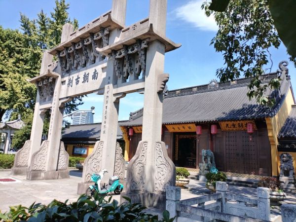 当走到这古寺的大门口,正南门一座高耸的廊坊石牌巍峨屹立,气势彰显恢宏,牌坊的下部有四支方形的立柱,还连有细腻的盘花底石,上部的横?凹凸有致,精雕细琢,正中的石壁标有醒目的几个大字“南朝古刹”。虽这牌坊寂静雅致,但从中镌刻了岁月的?迹,并见证了历史的沧桑,其宏伟壮观的景象足显神威,宛如一位沉默的守护神。