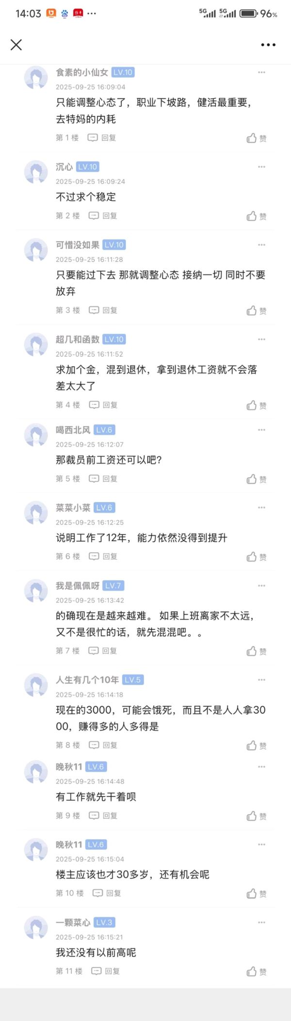 回 第24楼(越古超今)的帖子 越古超今:实习期6个月,每月1000不到,前三年3000-4000每月,现在拿到手1W不到,一年到手20W不到,不算公积金。唉,比上不足,比下有余,吃不饱,饿不死。 (2025-09-28 18:04)