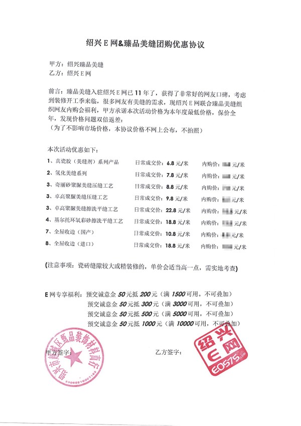 前言:臻品美缝入驻绍兴E网已11年了,获得了非常好的网友口碑,考虑到装修开工季来临,很多网友有美缝的需求,现绍兴E网联合臻品美缝组织网友11周年内购会福利,甲方承诺本次活动价格为本年度最低价格,保价全年,发现价格问题双倍返差!