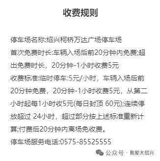 据了解柯桥万达车辆入场免停20分钟超出后按照一小时5元计费每日封顶60元