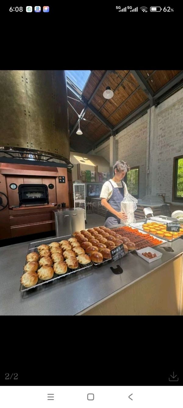 昨天,越城区富盛镇的上旺村也早已人头攒动,新开业的石窑工坊成为长三角游客的“心头好”,路旁停放着众多来自江苏、上海、安徽等地的车辆。从江苏自驾而来的李女士一家,正对着白墙绿竹环绕的玻璃房拍照,而这座由旧礼堂改造的空间里,开放式石窑正跃动着火焰,刚出炉的法棍发出酥脆声响。“特意为窑烤面包而来,咬下去满是麦香,配着山野景色太治愈了。”李女士端起咖啡杯,镜头里窑壁的斑驳与远处的青山构成绝佳画面。