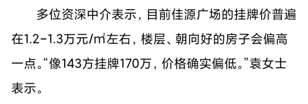 多位资深中介表示,目前佳源广场的挂牌价普遍在1.2-1.3万元/㎡左右,楼层、朝向好的房子会偏高一点。“像143方挂牌170万,价格确实偏低。”袁女士表示。
