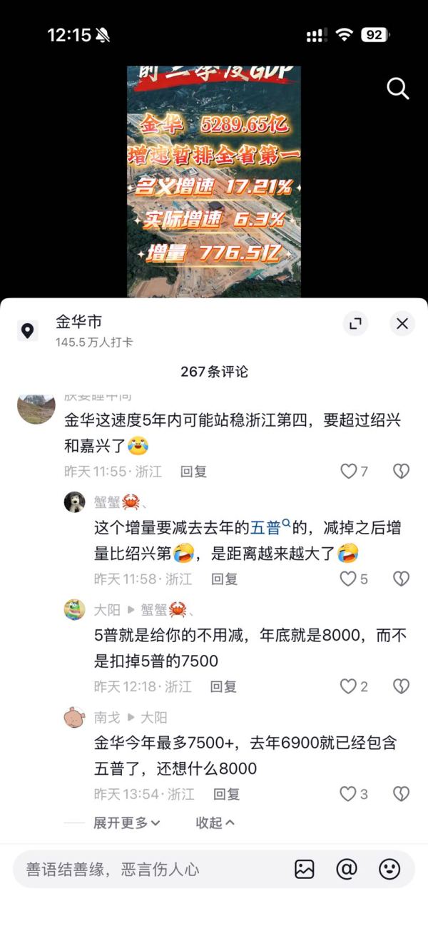 回 第8楼(绍兴正在崛起)的帖子 绍兴正在崛起:加了5普的,去年金华5普增量478亿,你算他三季度调增350好了,名义增长大致8.8左右,实际增量425亿左右。绍兴一样去掉普查增量,增量也有430亿左右,跟金华增量应该是伯仲之间,名义也有7.3左右 (2025-10-24 22:45)