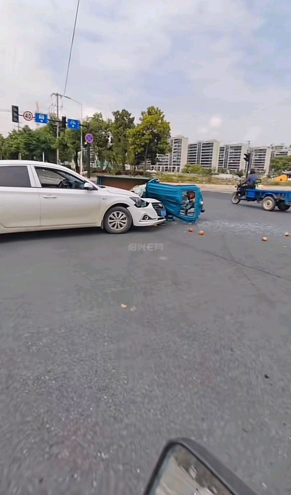 下午2点多,袍江东安路与育贤路发生一起汽车与电瓶三轮车碰撞事故。从现场看,二车都严重变形。电瓶三轮车车主已经送医院治疗。等待交警处理。