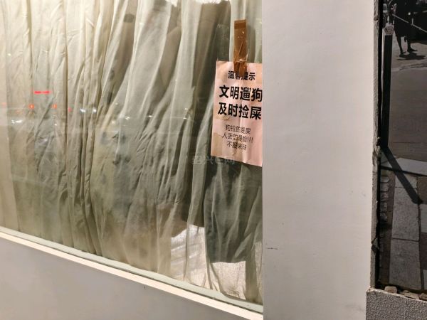 解放南路一商铺门口贴有一张温馨提示,文明遛狗,及时捡屎,狗拉的是屎人丢的是脸!!!不服来辩。估计店主人备受狗屎困扰。
