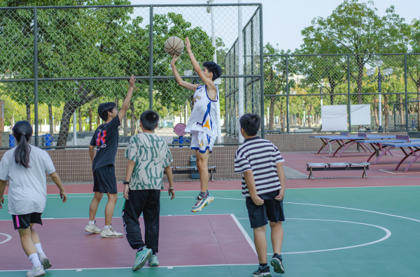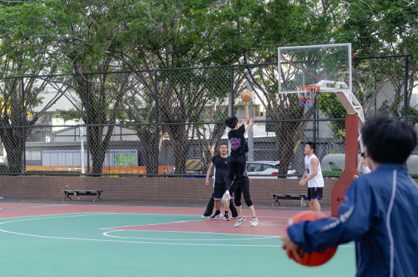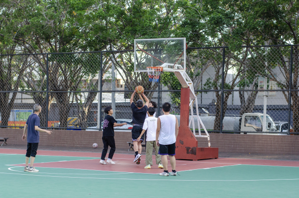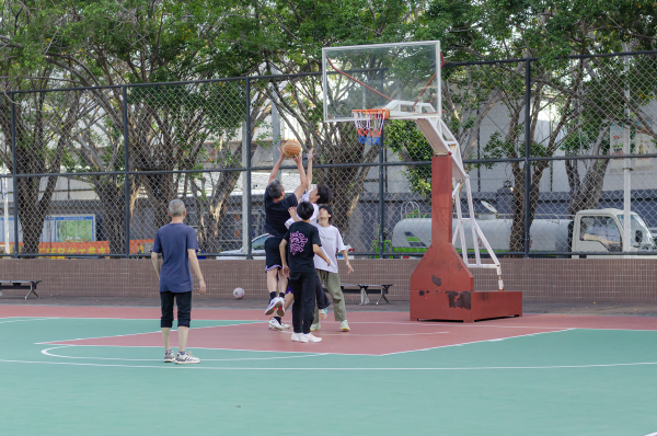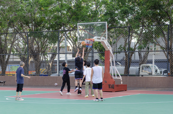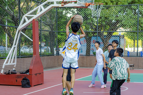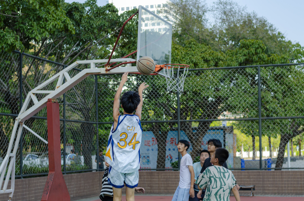 一边球板是初中生在玩,一边球板是老中青混合,看了好一会,都个子矮,没看到扣篮,都是跳起来远投
