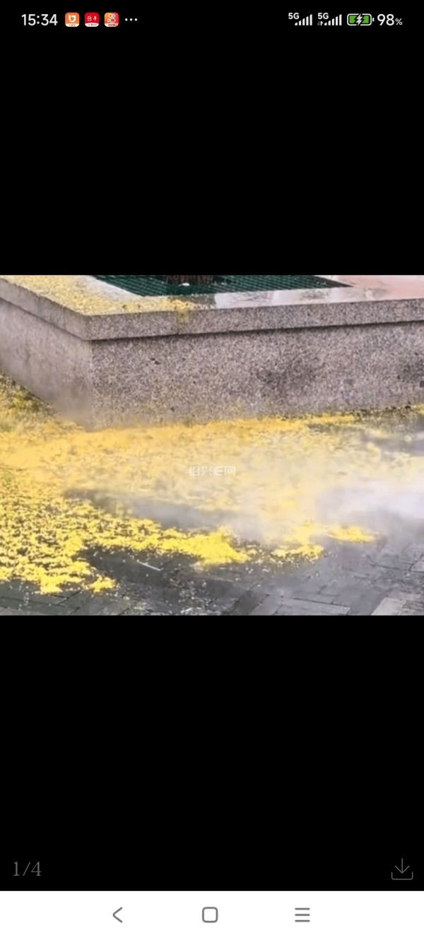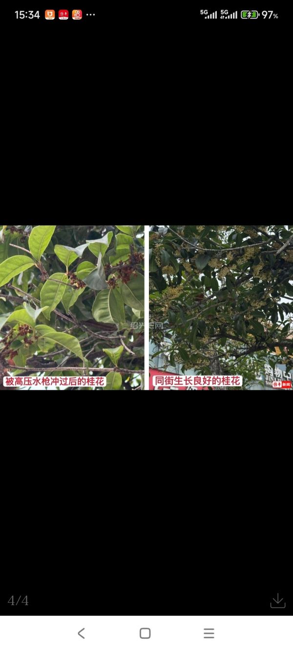 现在本是桂花飘香的季节,好好的花长在树上为什么要冲掉呢?”昨天(11月9日),有网友向越牛新闻报料称,在绍兴柯桥步行街,有环卫工人使用高压水枪冲刷正值盛花期的桂花树,导致花瓣洒落一地。