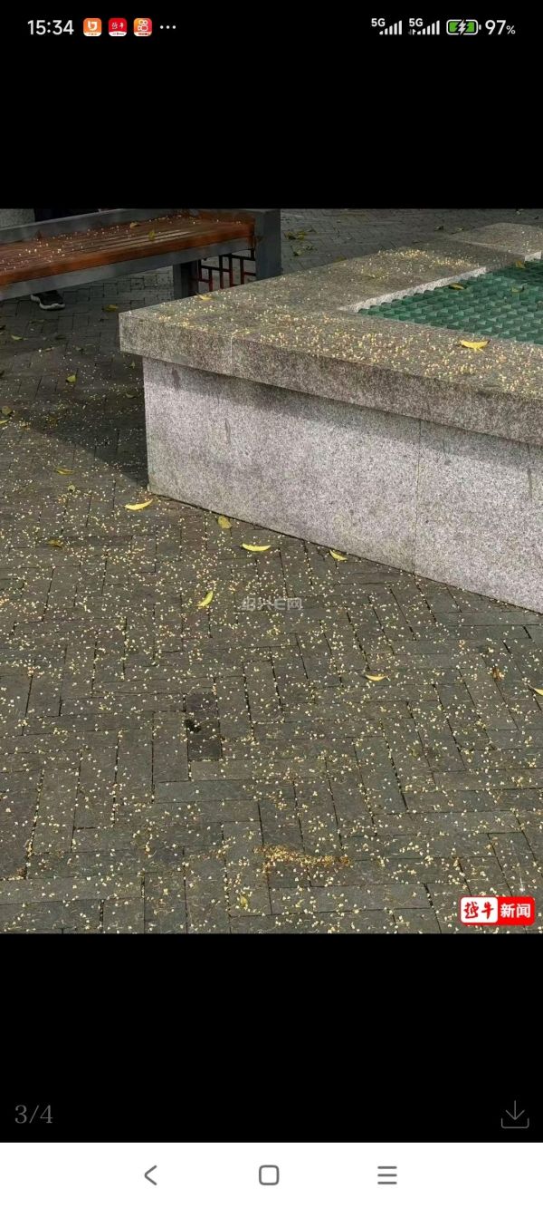 越牛新闻记者在现场看到,步行街上的桂花确如舒阿姨所说,每隔十几分钟便有大量桂花簌簌而落,长椅和地面很快被花瓣覆盖,确实为环卫清扫带来不小的压力,这才出现有直接拿水枪冲刷桂花树的现象。当记者看到那片被高压水枪冲刷过的桂花树时,景象令人惋惜:枝头桂花已大片凋谢发黑,与其他金黄鲜活的花丛形成了强烈反差。