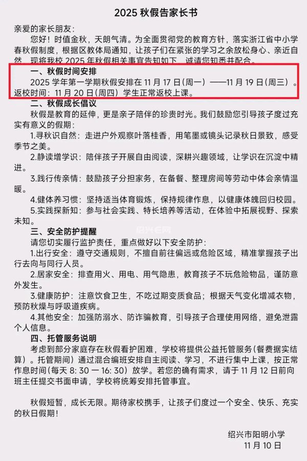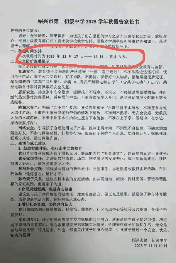 从下周一开始,绍兴首个秋假即将开始!从昨天开始,绍兴市区各个初中、小学都已经发了通知!有的是纸质回执,有的是钉钉告知书,你家孩子学校通知了吗?