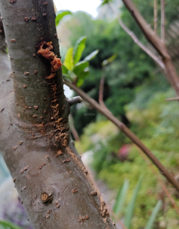 如图,一颗海棠树发现有虫害,也有小孔,树木长势不良,给使用哪一种药水如何处置?