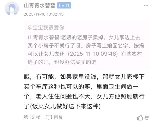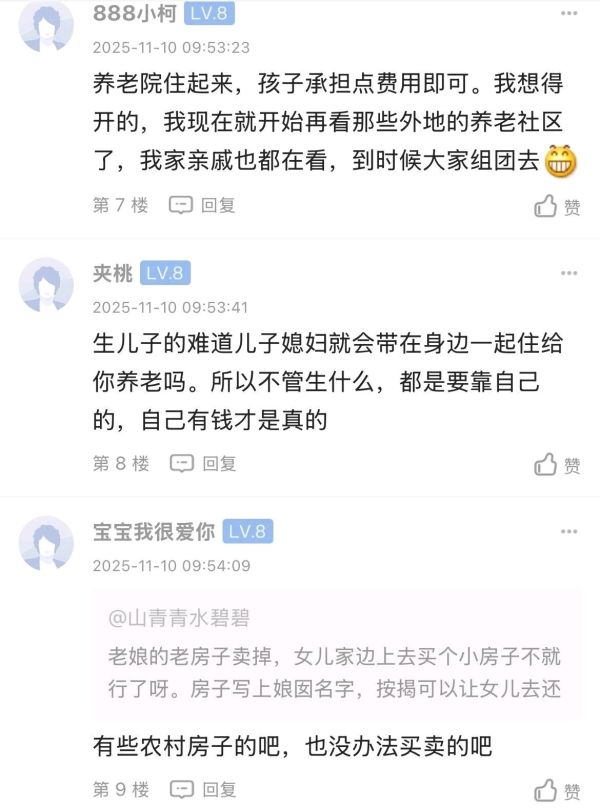 一想到我家也就个女儿,想到养老也愁的,只能自己先多赚点钱了,再不行找个好的养老社区买房住过去了,不然咋办,换了我是男方,我估计不乐意我自己还没住过去,亲家先住进我买的房子让我儿子养老了。