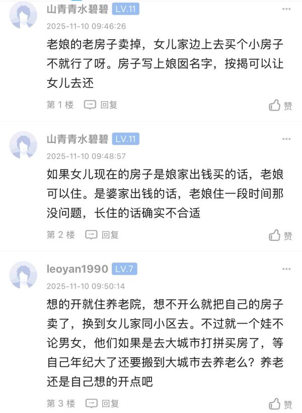 女婿也有父母要照顾,好像住过去不合适也开不了口吧,直接去敬老院?但这也不是人人都喜欢的。