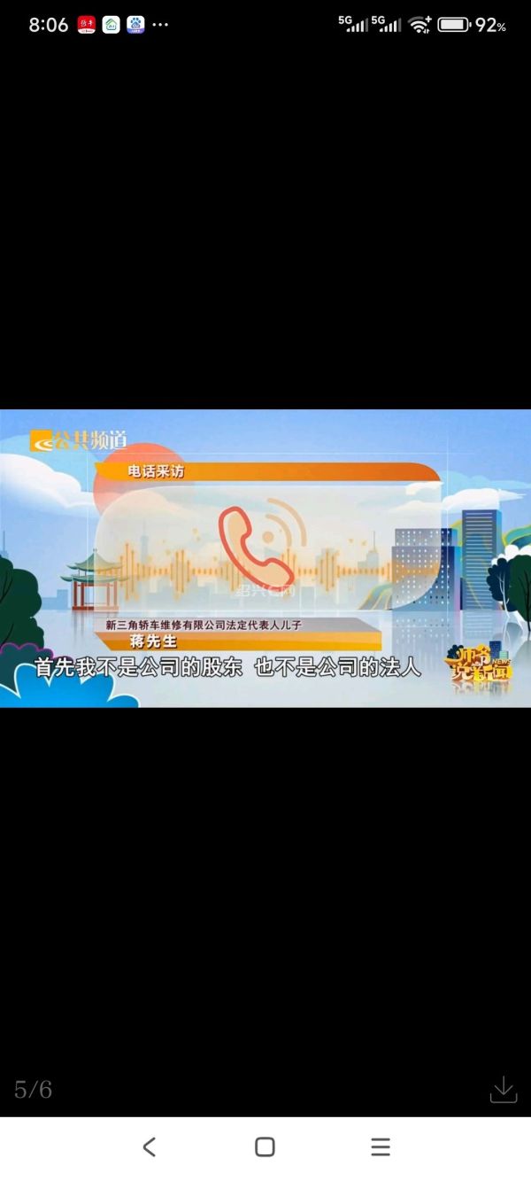 新三角轿车维修有限公司法人儿子 蒋先生:首先我不是公司的股东,也不是公司的法人,我也不参与公司的生产经营管理,你跟我来说也没用啊。