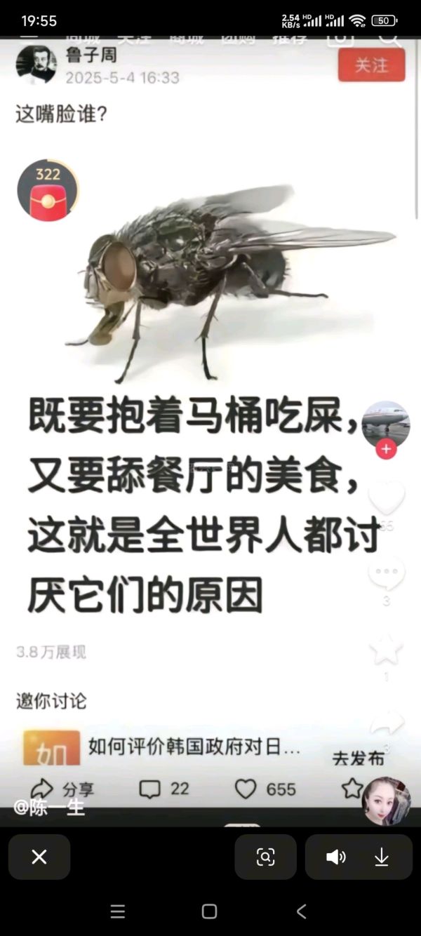 回 第35楼(紫杉)的帖子 紫杉:污苍蝇比你强多了,至少它的4条腿一条都没跪着 (2025-11-16 08:51)