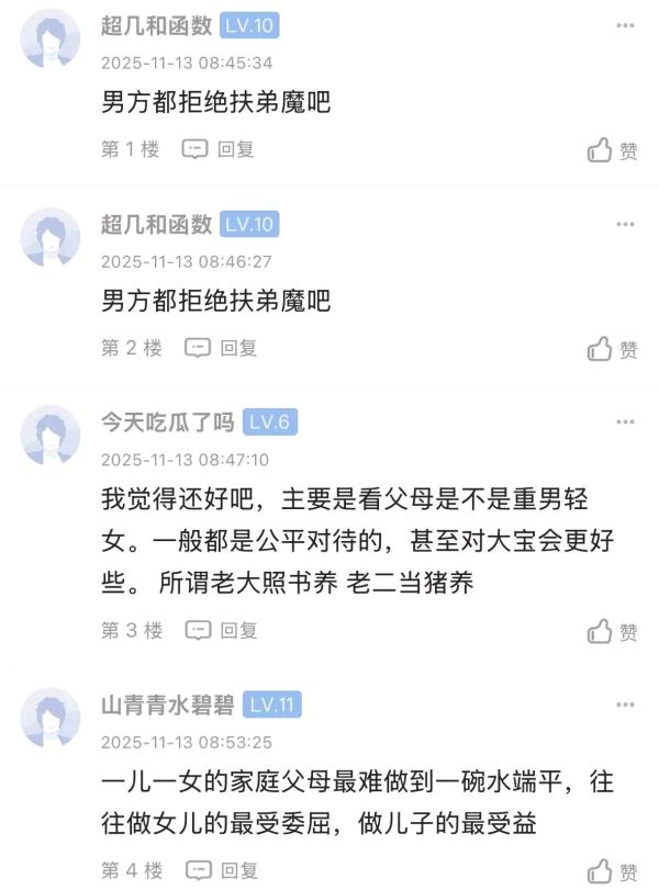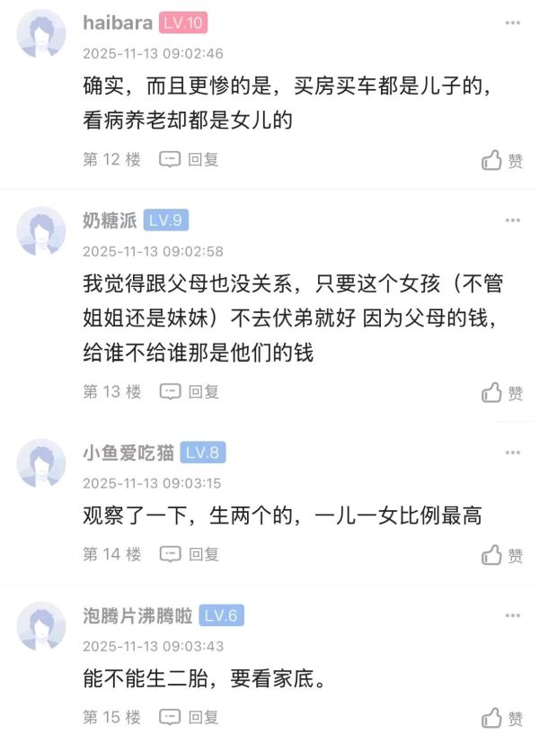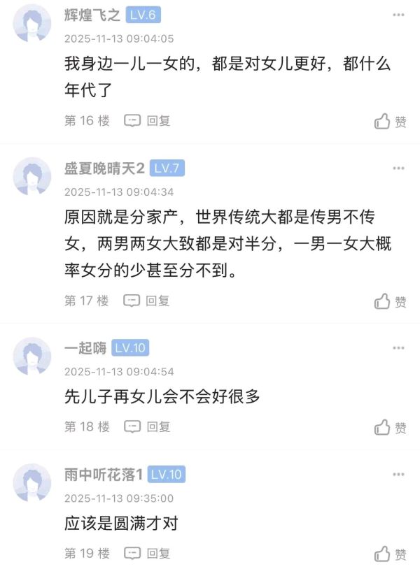 回 第33楼(i服了you)的帖子 i服了you:一儿一女能端平的真不多 (2025-11-17 06:13)