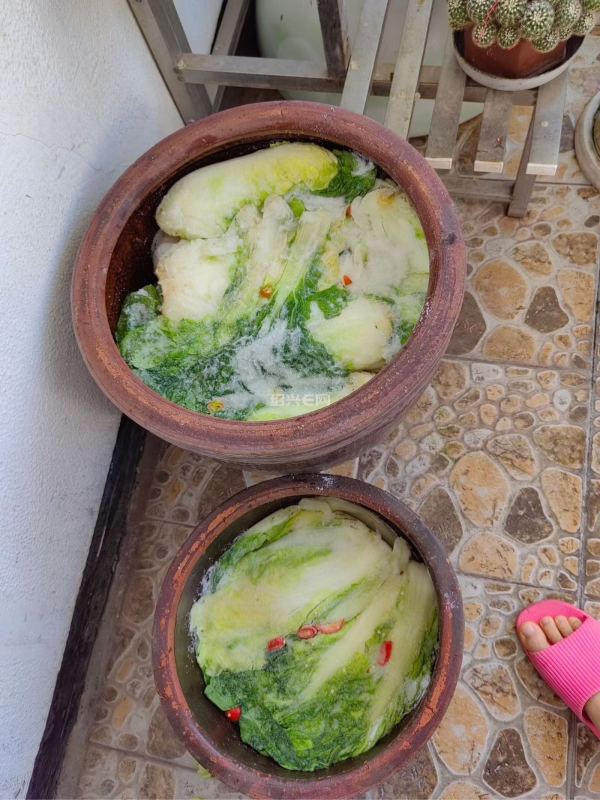 昨晚收回家后,放在小陶盆里,一层菜一层盐、红椒,一盆一盆用心踏好;最后再摞成一垛,在最上面的一盆里水,老娘说,这样做的目的是压实腌菜,既防酸又入味快。
