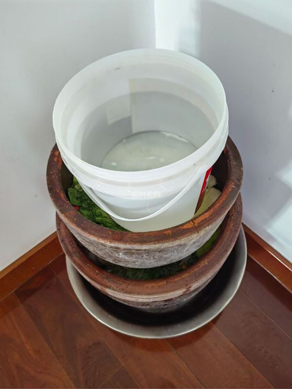 菜缸尽然放木地板上,盐水满出来木板都泡了