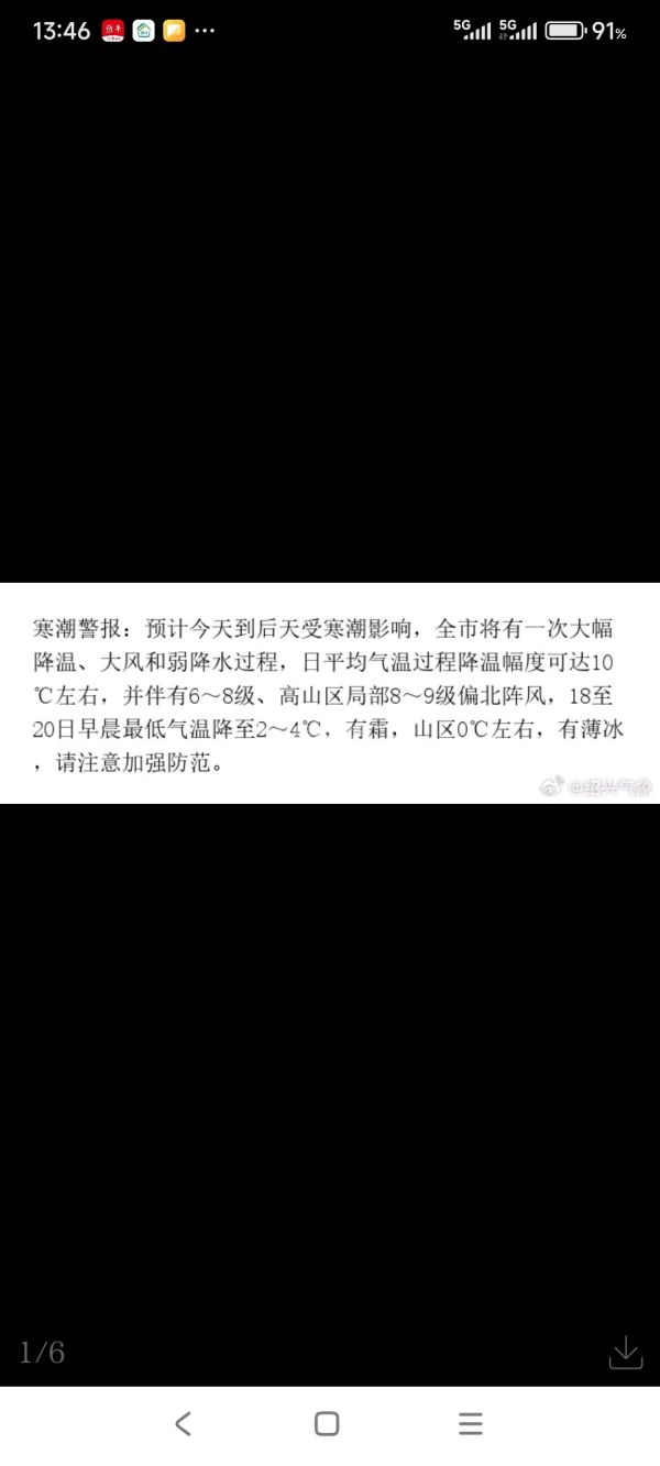据绍兴气象台发布的寒潮警报,预计今天到后天受寒潮影响,全市将有一次大幅降温、大风和弱降水过程,日平均气温过程降温幅度可达10℃左右,并伴有6~8级、高山区局部8~9级偏北阵风,18日至20日早晨最低气温降至2~4℃,有霜,山区0℃左右,有薄冰,请注意加强防范。