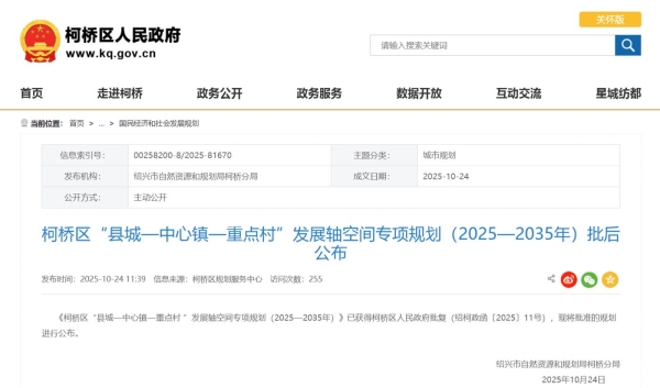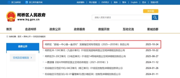 近日在绍兴市柯桥区人民政府网站上发布了关于柯桥区“县城—中心镇—重点村”发展轴空间专项规划(2025—2035年)批后公布!