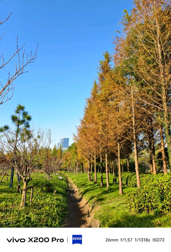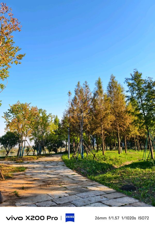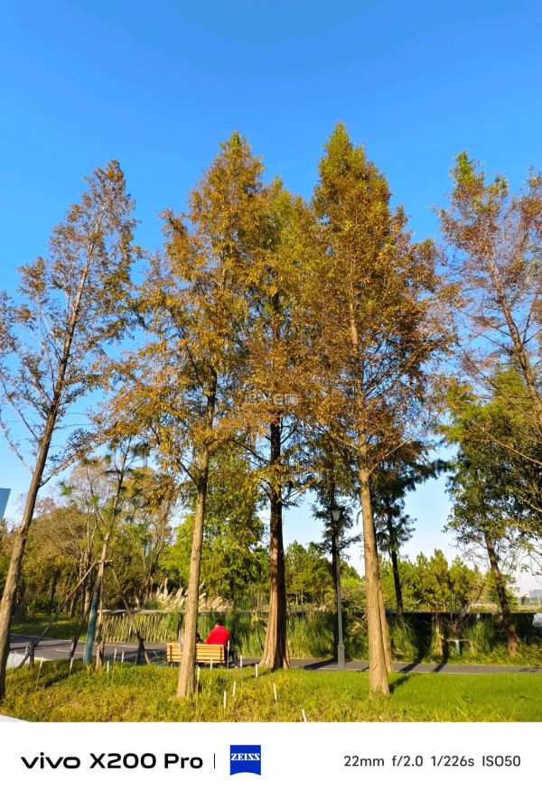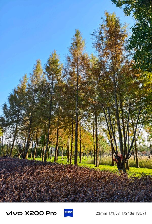 深秋初冬的湿地公园里水杉已经慢慢变红,公园里的树木色泽不同,红的绿的一片好景象让人陶醉,走在这里能感受到冬天已经来临。
