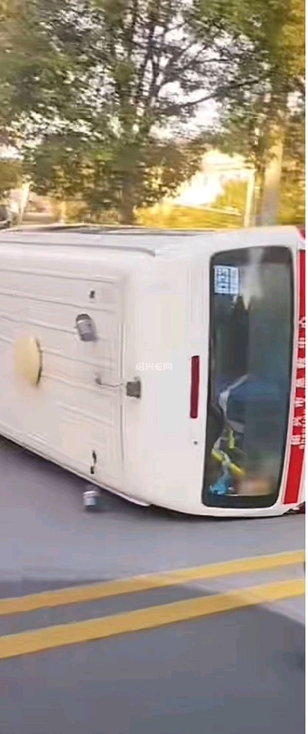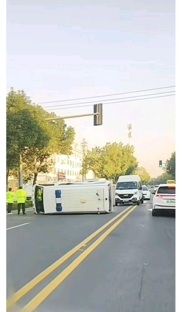 今天早上,绍甘线越崎中学一十字路口,一辆120救护车不知何故侧翻在地。路上有碎玻璃片。
