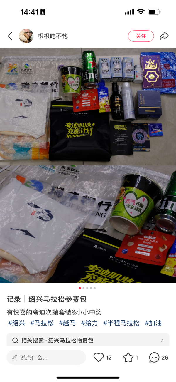 今年跑马拉松的参赛包居然有那么多东西!有能量胶、牛奶、喷雾、保湿霜等等,看来瑞丰银行今年拉赞助拉了不少。
