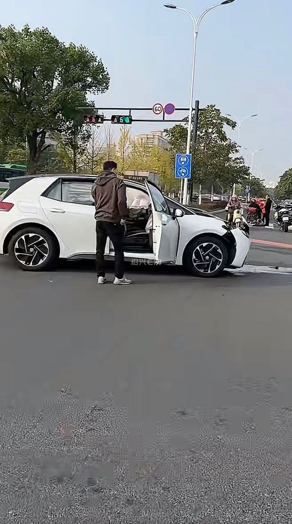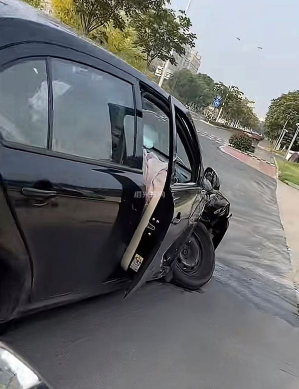 时间:今天下午五时;地点:嵊州钱杨大道五洲新春集团门口的十字路口;事件:南来的白车与东去黑车抢红灯猛烈碰撞。白车气囊弹出,引擎盖变形,黑车前桥断轴。交警正在现场处理。