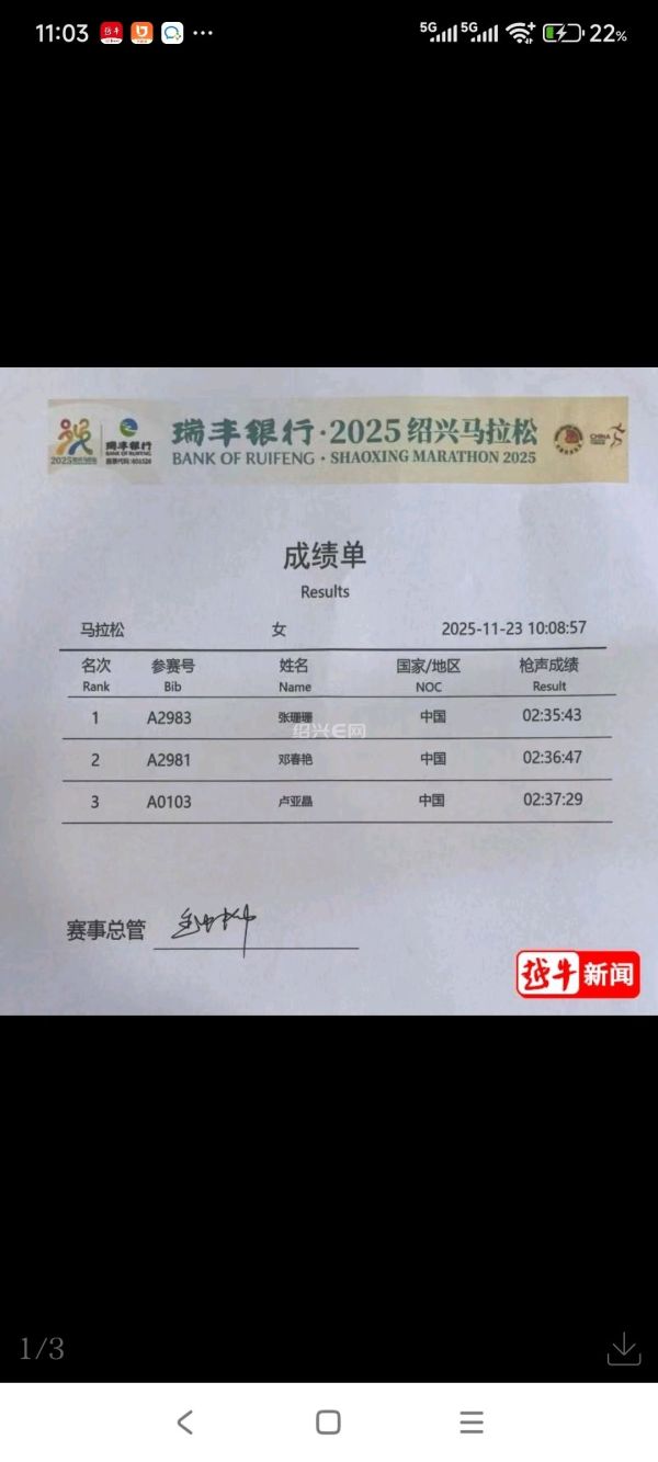 刚刚,瑞丰银行·2025绍兴马拉松全马男子组和女子组第一名,先后冲线!