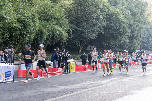 7点56分59秒 全马第一集团跑到了偏门直街和府山西路汇头