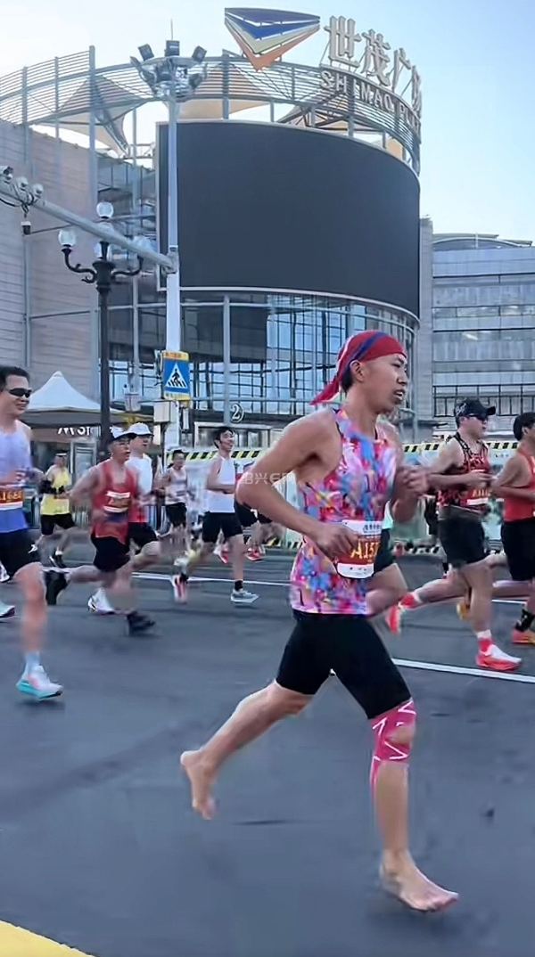上午越马队伍过世茂广场时,看见了一位赤足奔跑的健儿,引来了围观者的欢呼声,他真正诠释了“坚韧不拔”的马拉松精神。