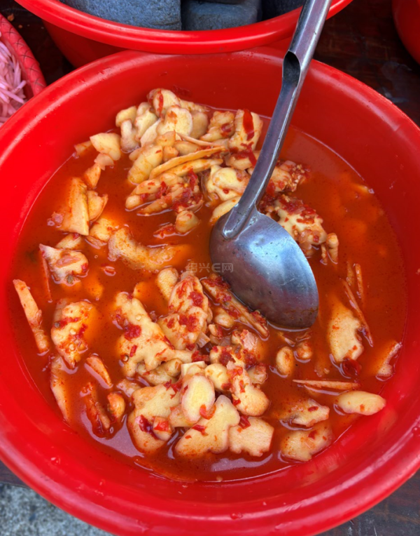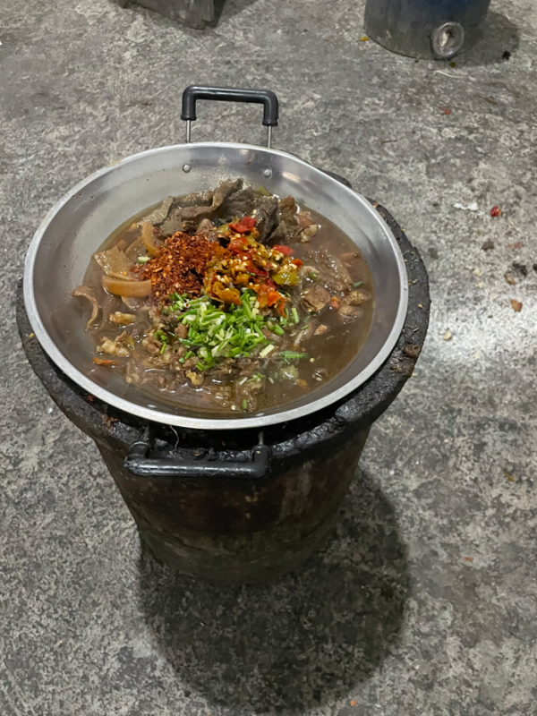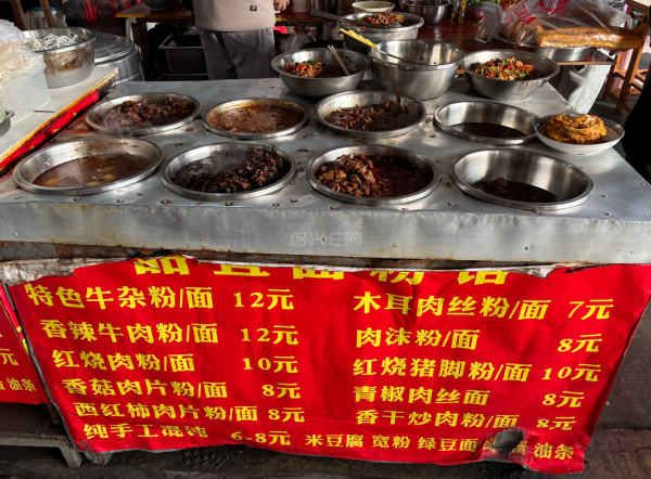 b、这个我觉得是集市上最有特色的一个店:一锅一人15元,牛杂牛肉等统统15元,然后自己找一个路子炖起来,旁边就是2块钱杯的白酒;