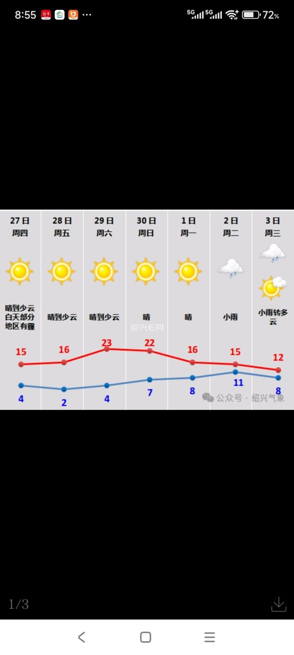 绍兴市气象台2025年11月28日6:00发布的短期天气预报:今天到明天晴到少云,今天部分地区有霾。偏南风2~3级。今天最高气温:15~16℃,与昨天基本持平。明天最低气温:4~6℃,山区2~4℃,有霜,比今天偏高2℃左右。后天晴到少云 7~22℃。