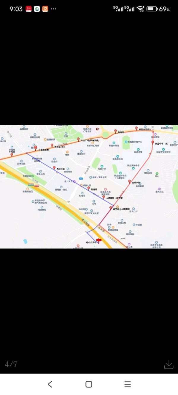 红色为大明市临时公交站线路走向,蓝色为搬迁至新昌北站后线路走向