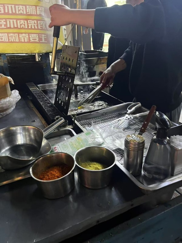 各大小吃推车卖着天南海北的的特色小吃,学校周边人流密集,自然而然聚集了多家小摊。