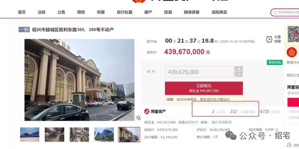 绍兴世茂广场,2024年首拍起价7.3亿元,由于前两次都是因无人竞价流拍,最近到10月29日第三次上架的4.39亿元,已经相当于原价6折出让。这次,终于有2家公司报名参加竞拍了,参加拍卖报名4396.7万元,需要真金白银掏出来,应该不会是虚报,就看最后花落谁家了!