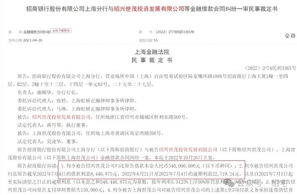 通过裁判文书网看到了,在2022年2月24日,绍兴世茂公司与招商银行股份有限公司上海分行签订一份贷款合同,贷款5.4亿,贷款期限自2022年2月28日起至2026年12月31日止,为期59个月,而贷款的抵押物,正是世茂广场。