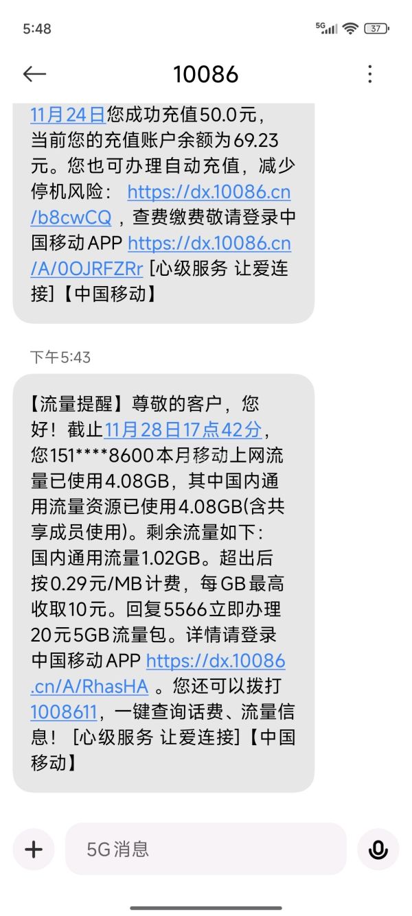 30元5G,家里和工作的地方有wifi,偶尔外出的时候用用,发发微信,浏览下网页什么的,不看视频,到了月底总是不够用。记得刚买智能手机的时候,80MB,这样子用,也能用一个月,现在5G还是一个月,手机升级快还是移动故意扣的多