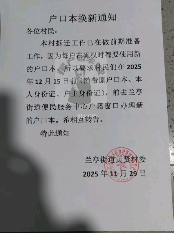 就在今天,兰亭街道发布通知:要求黄贤村村民在12月15日前,前往街道便民中心窗口更换新的户口本,为确权做准备,标志着黄贤村拆迁流程正式重启。