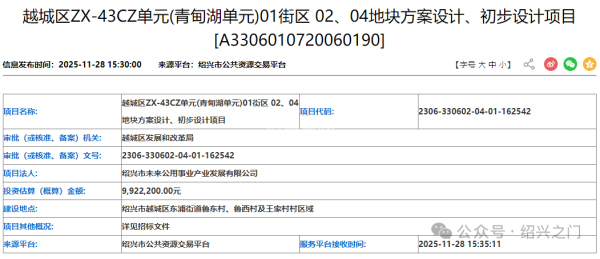 越城区ZX-43CZ单元(青甸湖单元)01街区02、04地块方案设计项目由绍兴市未来公用事业产业发展有限公司负责,投资估算约992.22万元,建设地点位于绍兴市越城区东浦街道鲁东村、鲁西村及王家村区域。项目已通过越城区发展和改革局审批。
