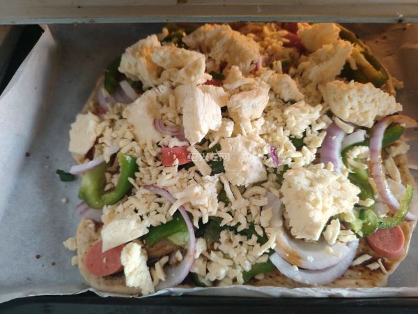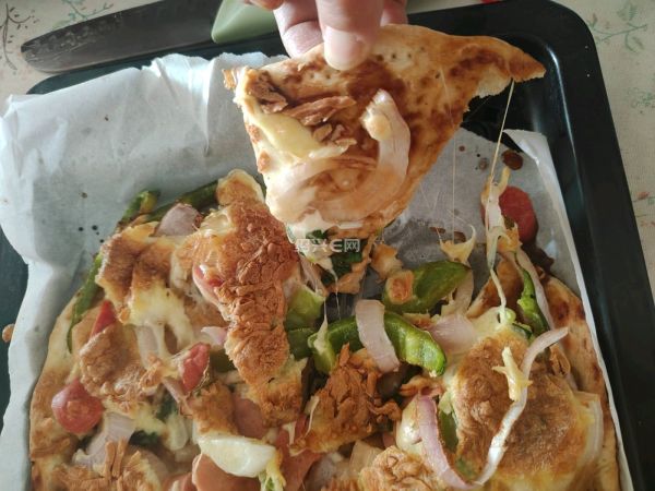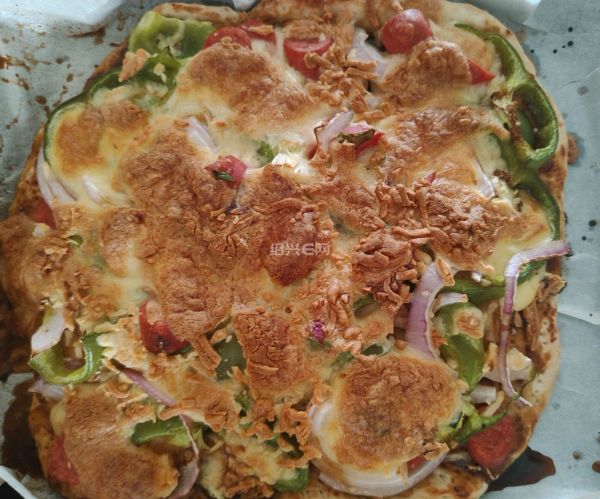 4.在面饼上涂上酱料,放一层奶酪,再放青红椒洋葱等,然后最后再放一层奶酪,多少酌情添加。烤箱预热200度,上下火,烤20分钟左右,香喷喷的披萨就出炉了,小心烫。
